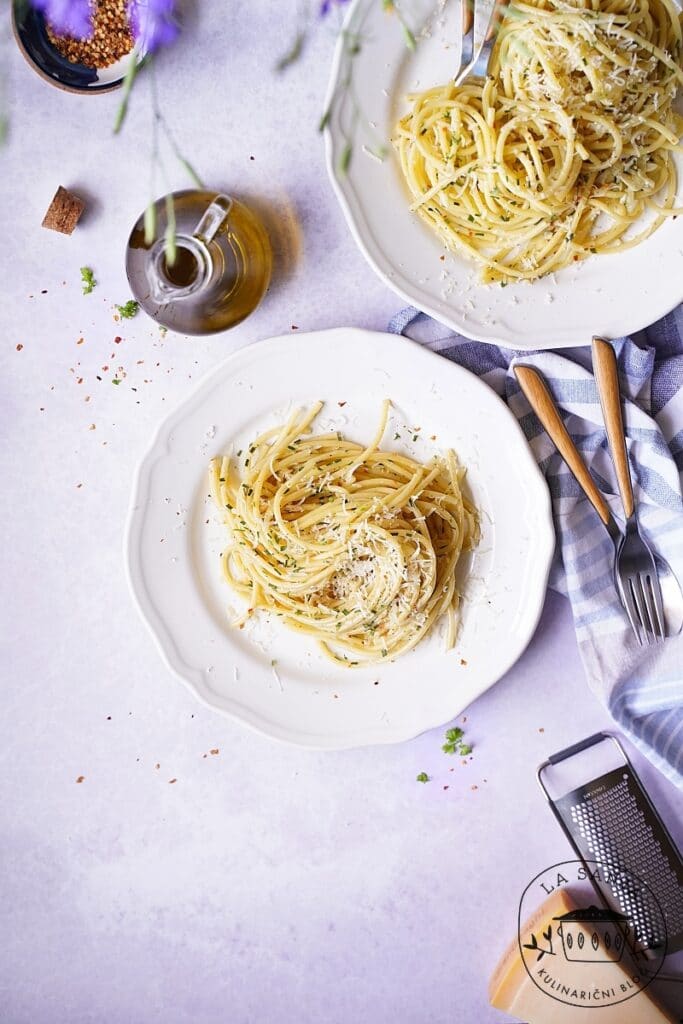 - Medtem se lotimo priprave ostalih sestavin. Česen očistimo in ga narežemo na kar se da tanke lističe. Na 5 velikih južnih žlicah olja ga 5-10 minut pražimo na nizkem ognju, da se razdiši. Česen se ne sme zapeči in postati grenek. Nato dodamo mlet čili in na drobno nasekljan peteršilj. Premešamo in zalijemo z 1-2 zajemalkama vode, v kateri so se kuhale testenine. Po okusu solimo in popramo, dodamo odcejene testenine in postrežemo z ribanim parmezanom, po vrhu pa pokapljamo z oljčnim oljem.