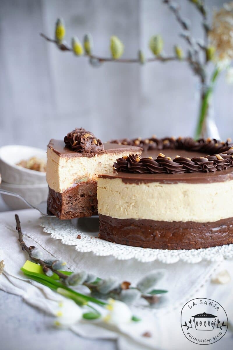 Mislim, da se čokolada poda vsemu. Sadju, napitkom, v kombinaciji s čim slanim, ali pa kar tako, brez vsega. Današnji test je to hipotezo tudi potrdil. Torta z brownie dnom, karameliziranimi bananami, mehko karamelno kremo in čokoladnim prelivom.