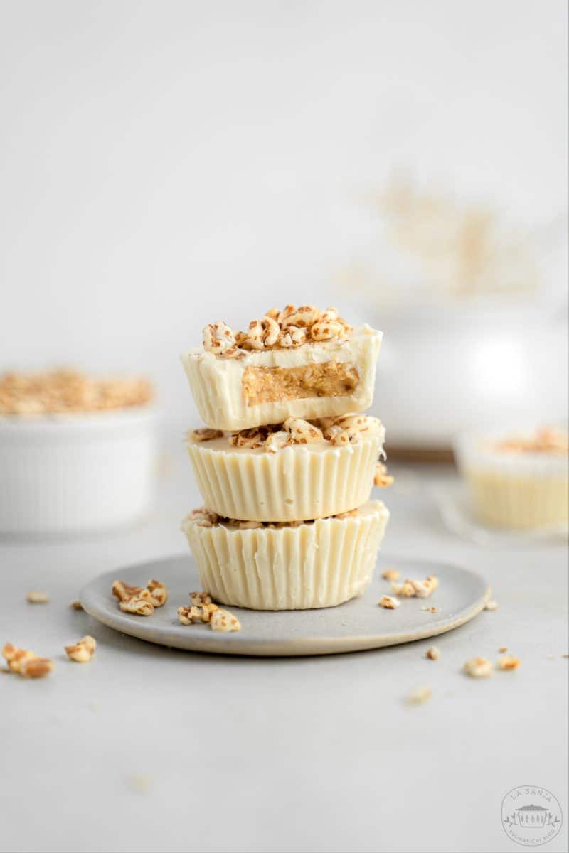 Tile zalogajčki so sestavljeni iz bele čokoladne kuverture, v notranjosti pa se skriva nadev iz belih mandljev, javorjevega sirupa, vanilje in ekspandirane pire, ki jo lahko po želji nadomestite tudi z rižem. Prav tako pa sem v nadev vključila tudi Rok’s mandljeve koščke, ki poskrbijo za crunchy efekt in super zaokrožijo tako teksturo kot okuse.