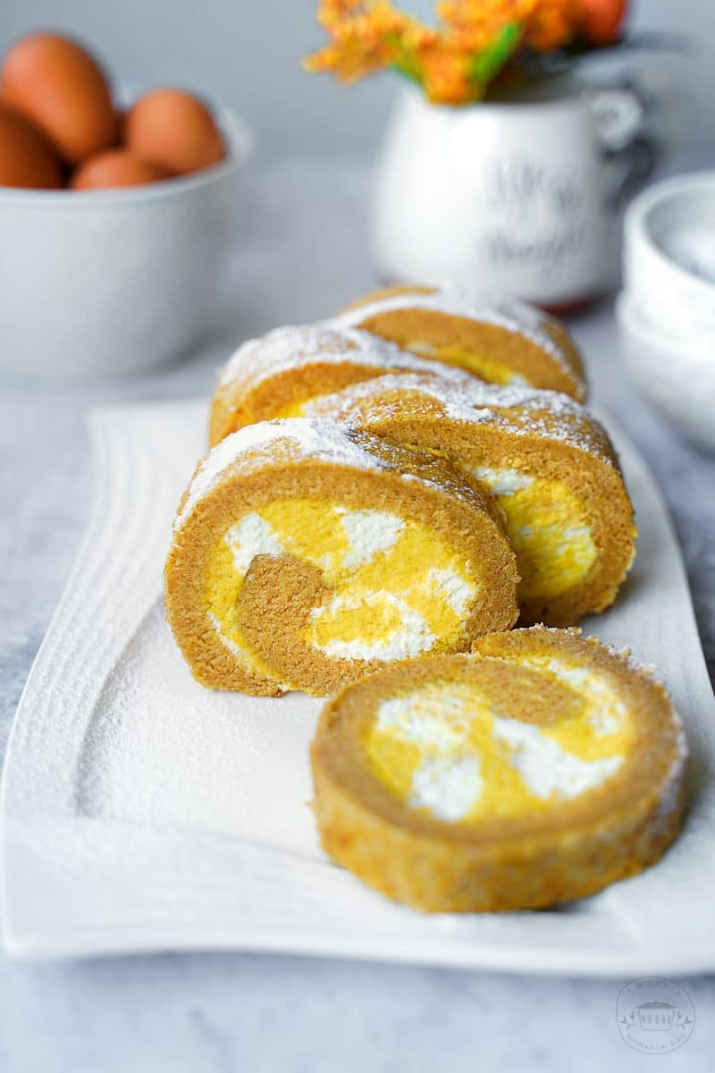 Kakorkoli, z rolado je malo več dela, ker se biskvit dela doma. Me je pa njen okus očaral še bolj kot pri tiramisuju. Neverjetno sočna, zelo lepo začinjena, z okusom po rumu in cimetu, biskvit pa neverjetno mehak. Čisto nič se ni lomil, bil je lepo prožen in zelo sočen skupaj s kremo, čeprav ga nisem posebej navlažila. Za povrh ne potrebujete nič ekstra dekoracije, samo malo sladkorja v prahu. Se mi celo zdi, da bi karkoli drugega uničilo okus notranjosti…