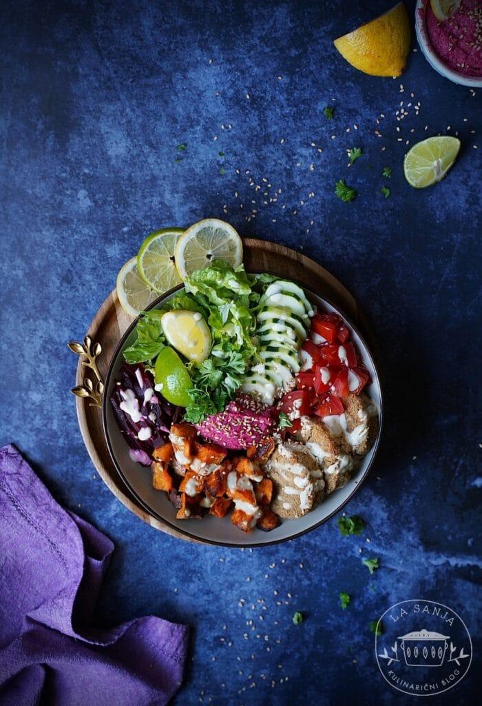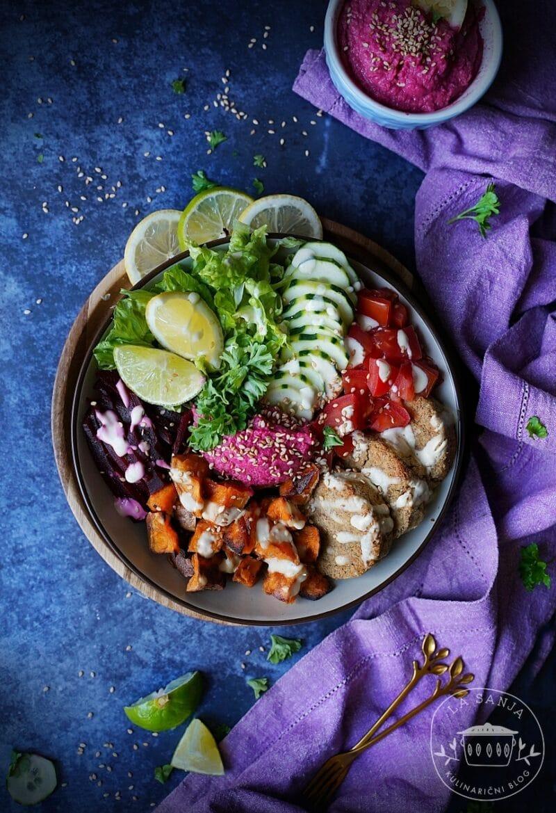 Za beljakovine si lahko vključite kakšno kvinojo, lečo, tofu, jajca ali pa meso po izbiri, pri ogljikovih hidratih lahko izbirate med rižem, krompirjem, ajdo, grahom in drugim. Kot osnovo pa se navadno na dno da kakšna solata, radič ali pa druga zelena zelenjava. Za namaz sem danes naredila domač pesin humus, ki ga lahko uporabite tudi kot namaz za sendvič ali tortilje ali pa kako drugače pokoristite.