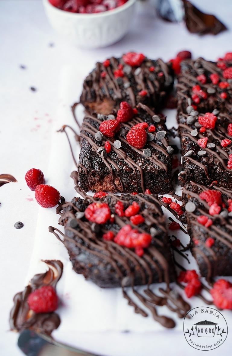 Čeprav tile browniji ne vsebujejo prave čokolade ampak zgolj kakav v prahu, je okus po njej dokaj izrazit. Njena grenkoba se nadvse poda sladkim malinam, ki to sladico dvignejo na drugo raven. Med sestavinami ne bomo našli mlečnih izdelkov, moke in dodanega sladkorja, njihova tekstura pa je naravnost čudovita – takšna, kot se za brownije spodobi, mehka in sočna.
