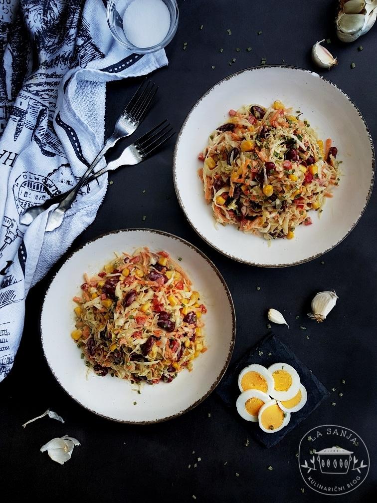 Današnja solata je nekako ‘nadgradnja’ zeljne solate, ki jo najbolje poznamo pod imenom ‘coleslaw’. Izvirala naj bi z Nizozemske, a je dobro znana po skoraj celem svetu. Medtem ko tradicionalna verzija vsebuje zgolj rdeče in belo zelje ter naribano korenje z majonezno-gorčičnim dresingom, sem svoji dodala še nekaj okusnih elementov, ki sem jih nato povezala s kremastim prelivom v čudovito solatno prilogo, ki bo teknila v vseh letnih časih.