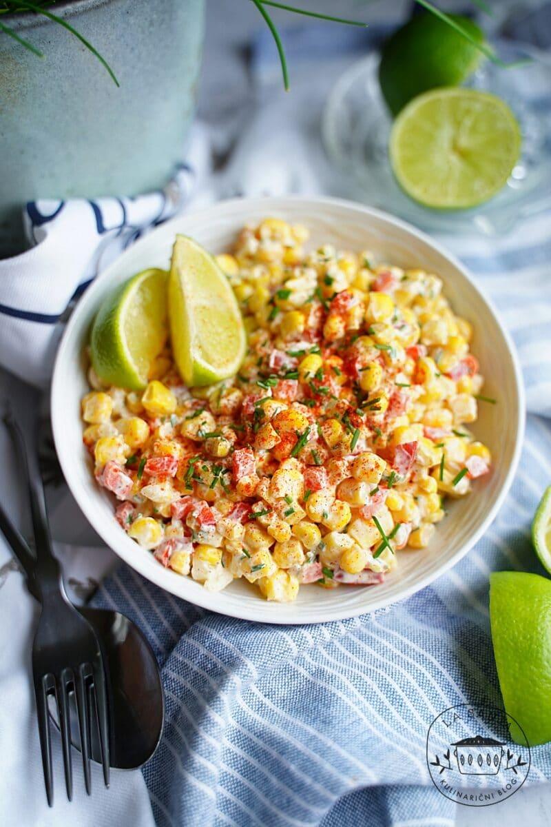 Ko je koruza v domačih krajih že dovolj visoka, vem, da je poletje v polnem teku. Zaspani sončni dnevi in topel veter so idealni za druženje v senci ob skupnem kosilu ali pa na kakšnem pikniku. Današnji recept se bo kot nalašč podal katerikoli jedi z žara, pa naj bodo to meso, zelenjava, krompir ali pa zgolj bel kuhan riž. Postrežemo jo lahko kot toplo prilogo ali hladno solato. Za še večjo svežino ji lahko dodamo tudi sveže kumare, feto ali pa na koščke narezan avokado. Enkratna jed za malo drugačen jedilnik in hitro kosilo.