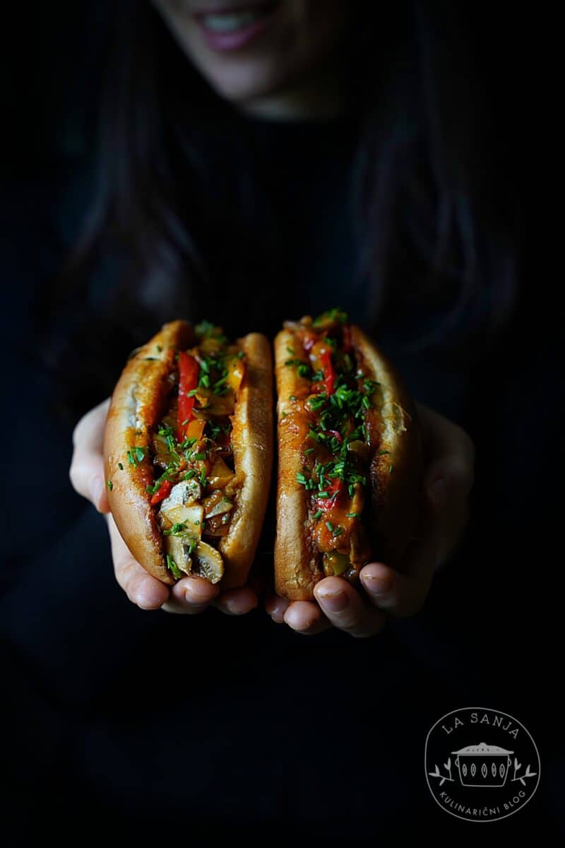 - Najprej se lotimo rezanja zelenjave. Čebulo in papriko narežemo na tanke trakove, šampinjone na rezine, paradižnik pa sesekljamo. Hot dog štručke prerežemo po dolgem, vsako polovico premažemo z oljčnim oljem in jih za 10-15 minut postavimo v pečico na 180-200 stopinj, da se lepo zapečejo in postanejo hrustljave.