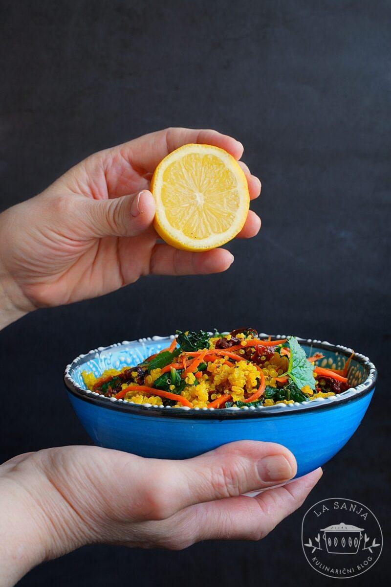6. Na olju najprej prepražimo korenček in paradižnik, nato dodamo še začimbe. Zelenjava naj bo še nekoliko trda na ugriz. Na koncu dodamo še špinačo in premešamo. Čisto na koncu dodamo še kvinojo in pazljivo premešamo, da je ne zmečkamo. Postrežemo toplo ali malce ohlajeno s hrenovim prelivom, za katerega preprosto zmešate vse sestavine.