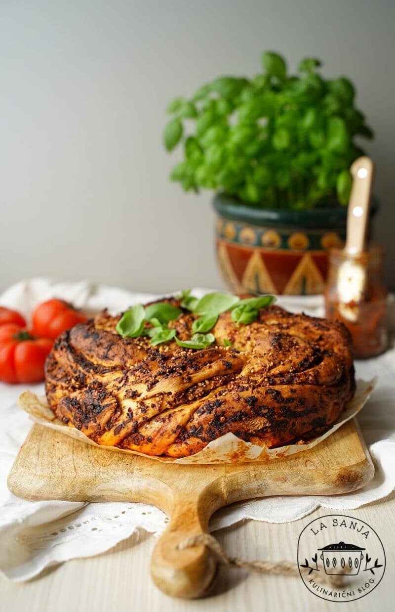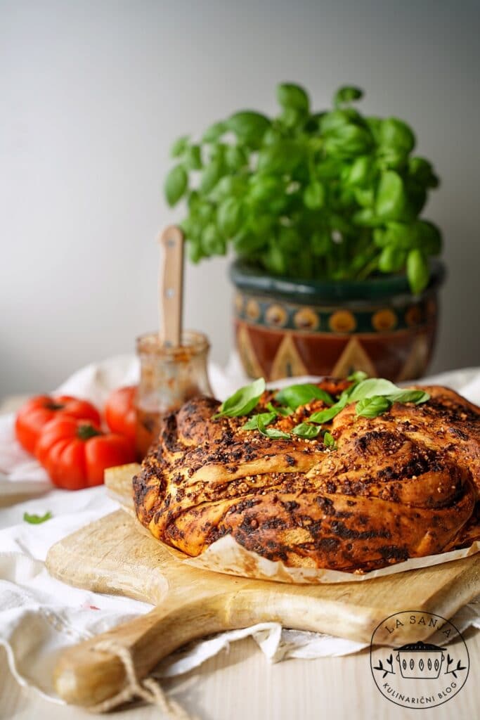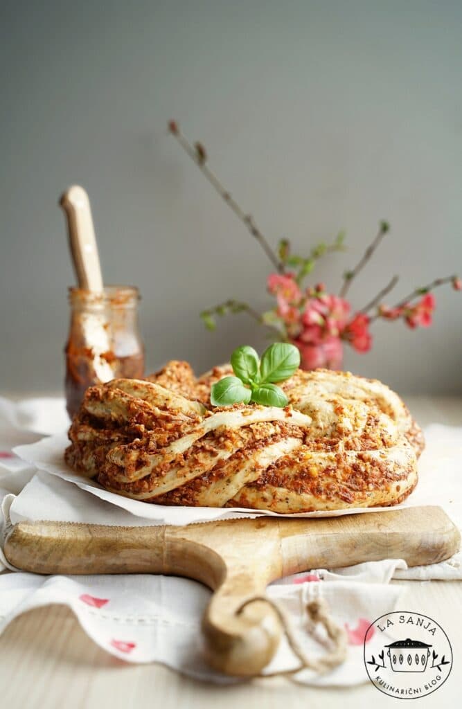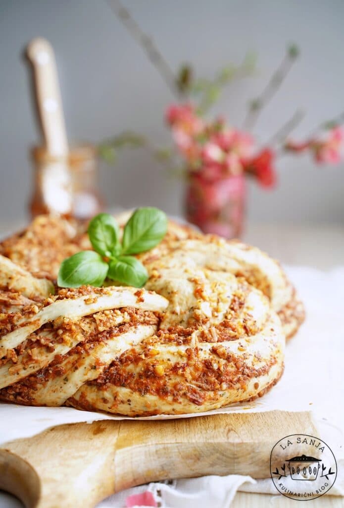 [recipe title=”Pletenica s pestom iz pečenih paradižnikov” servings=”4-6 oseb” time=”3 – 4 h” difficulty=” 24 cm”]