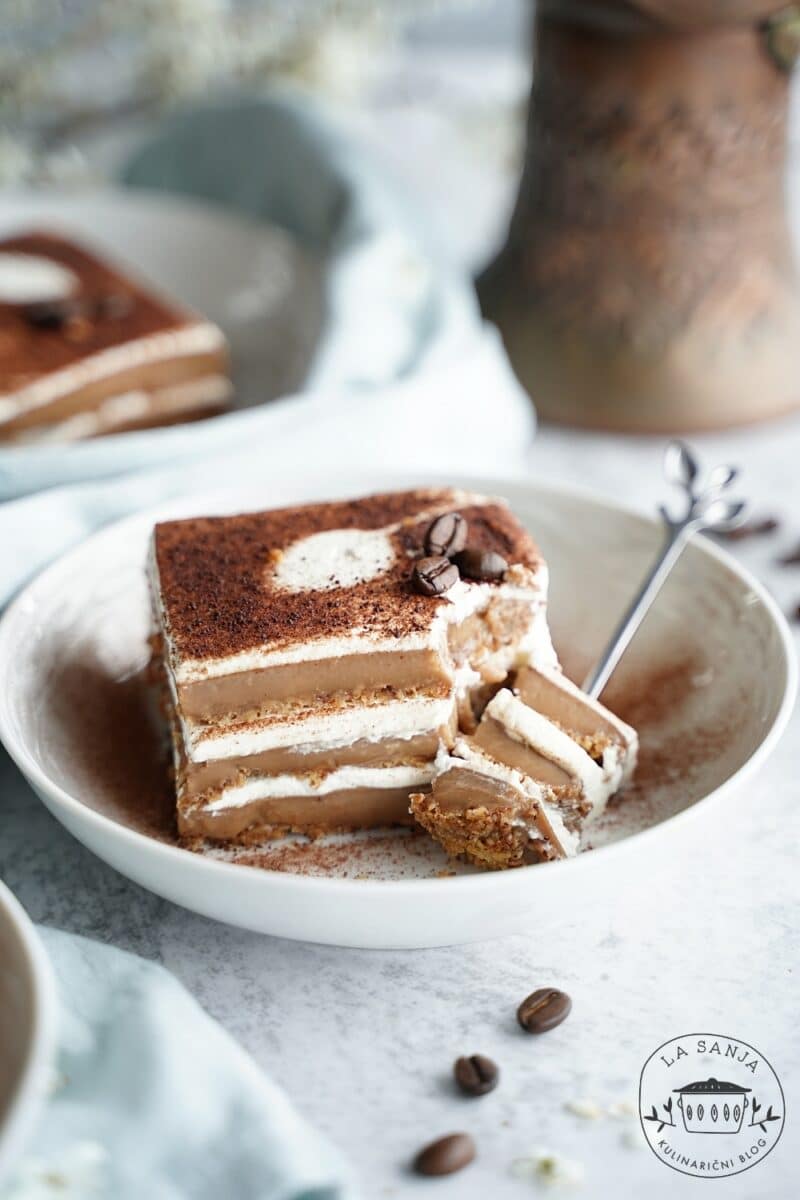 Če izvzamemo sladice v kozarcu, ki že po naravi spadajo pod sladice z bolj mehko teksturo, je tale kavna krasotica res ena izmed najbolj kremnih rezin, ki stojijo same od sebe. Je zares enostavna za pripravo, prav tako pa zanjo ne bo potrebno prižgati pečice. Plasti slastne sladke smetane in pudingovega biskvita s kavnimi notami spominjajo na tiramisu, le da je slednji še nekoliko bolj sočen.