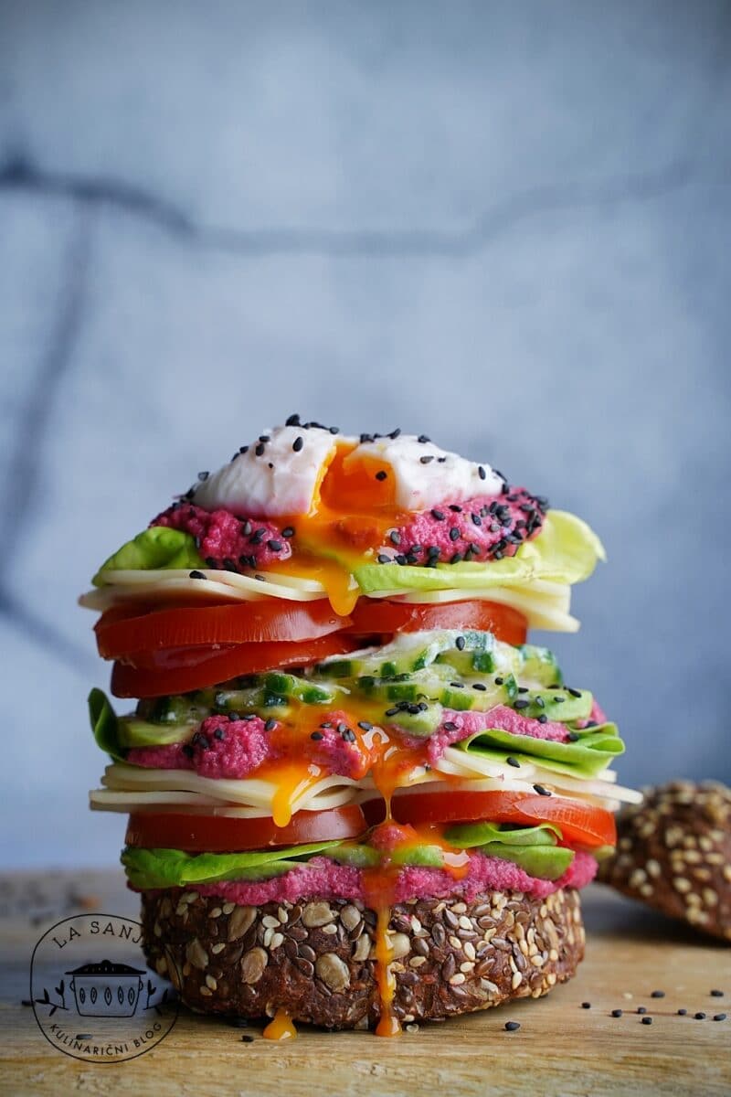 - Premažemo s humusom, čez v več plasteh razporedimo zelenjavo in začnemo s pripravo poširanega jajca.