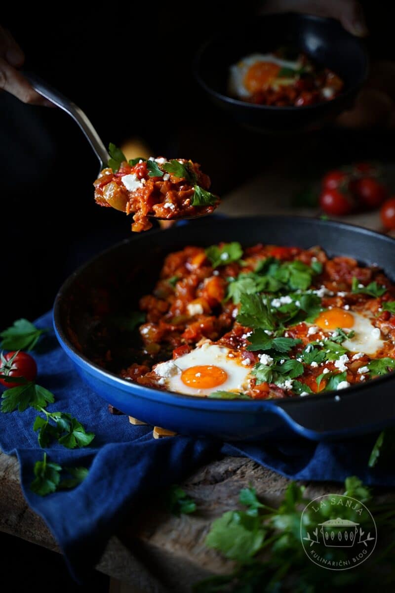 Shaksh(o)uka je tradicionalna jed Bližnjega Vzhoda. Stoletja nazaj so jo za časa Otomanskega cesarstva pripravljali z mletim mesom in zelenjavo. Leta tradicije so iz te jedi napravila več različic jedi, npr. take z mletim mesom ali sirom, najpogosteje feto. Glede na to, da so jajca v večini variant rdeča nit jedi, se najpogosteje servira kot zajtrk ali dopoldanska malica. No, pri nas pa smo jo imeli kar za kosilo.