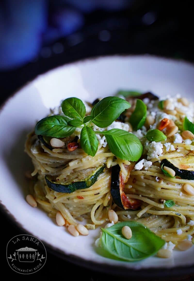 Zaradi svojega bolj kot ne nevtralnega okusa se je danes znašel v družbi bazilike in dveh vrst sirov – mascarpone za še boljšo teksturo in ovčji sir, ker, ker…. ni bilo doma parmezana. 🙂 Uporabila sem ovčji sir v slanici, ki je podoben feta siru, ki sem ga nato razdrobila po vrhu. Njegov specifičen okus in slanost sta se jedi podala bolje kot klasika. Seveda pa ga lahko zamenjate za parmezan. Ne glede na to, da je omaka dobra že sama po sebi, mi je vseeno nekaj manjkalo. Nekaj zelenjavnega, v kosih, poleg testenin in omake. Tako sem zraven popekla še bučke, ki sem jih na koncu na rahlo vmešala v končni izdelek.