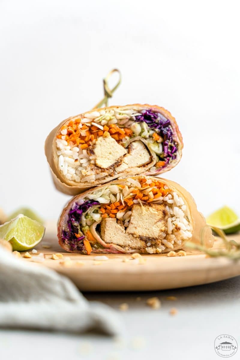 Tokratna verzija je zelo enostavna – mariniran tofu v arašidovi omaki, sveža zelenjava, namaz in guacamole. Pa seveda kuhan riž – brez njega ni burrita. 🙂